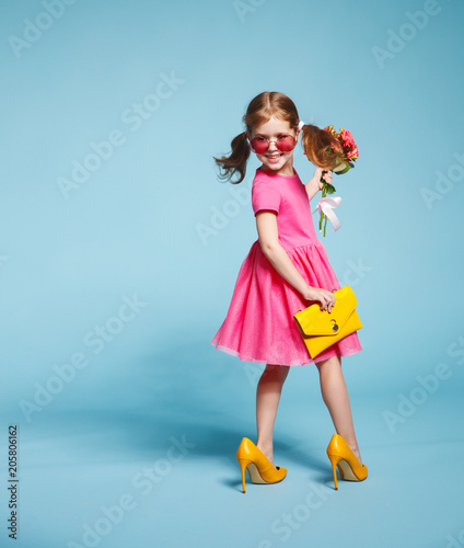 Fototapeta premium funny child girl fashionista in big mother's shoes on colored background