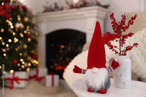 © New Africa, Naklejka premium Funny Christmas gnome on white table in decorated room. Space for text