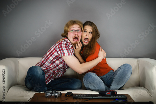 © Voyagerix, Naklejka premium Funny couple watching horror movie