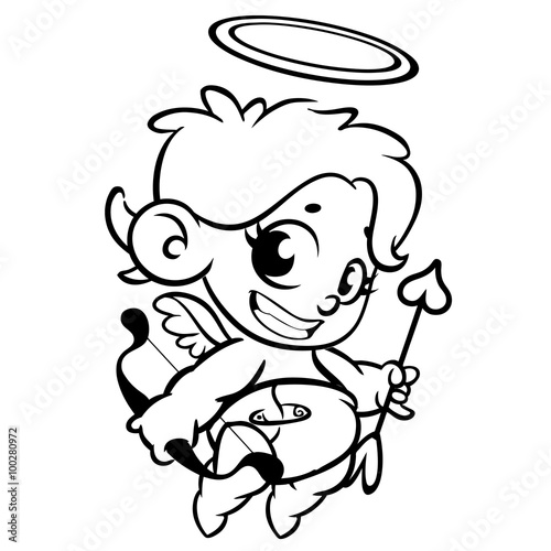 © drawkman, Naklejka premium Funny cupid with bow and arrow. Illustration of a Valentine's Day. Monochrome vector line art isolated