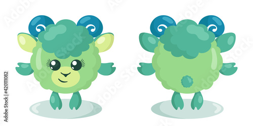 © Tatjana, Obraz premium Funny cute kawaii lamb with round body in flat design with shadows, front and back. Isolated animal vector illustration