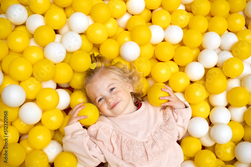 © Ольга Смолина, Obraz premium Funny cute little caucaisian blonde baby girl,toddler, smiling kid having fun in ball pool,playing with yellow white balls.Happy child looking at camera in playground,top view