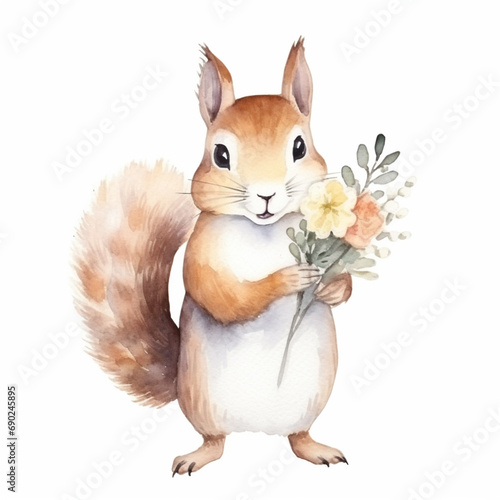 © PEPPERPOT, Fototapeta premium Funny Cute Red Squirrel Holding Flower Bouquet. Isolated on white. Spring watercoloor illustration.