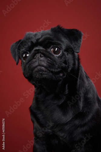 © Anna Averianova, Obraz premium Funny dog. Sad pug on a red background in the studio. pet indoor