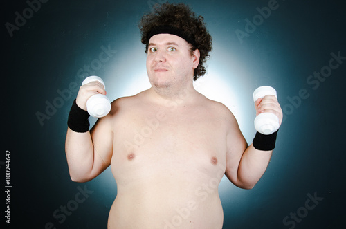 Fototapeta premium Funny fat man doing sports. Healthy lifestyle.