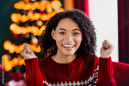 © deagreez, Fototapeta premium Funny festive moment as a woman in a red sweater cheers at home with a glowing Christmas tree and warm holiday vibes