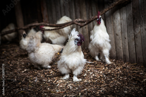 © AnyaNewrcha, Fototapeta premium Funny frizzle white chicken in zoo