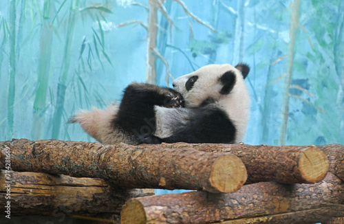 © valeriyap, Fototapeta premium Funny giant panda (Ailuropoda melanoleuca) cub. Delicious paws