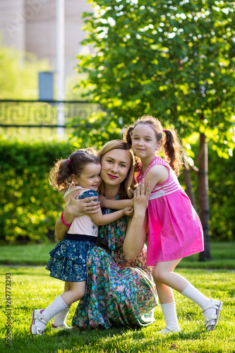 © Denis, Obraz premium funny girls walking on the lawn with her mother. Sisters play together with mom. maternal care. happy family
