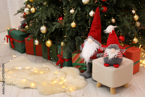 Naklejka premium Funny gnomes near Christmas tree and gift boxes in decorated room, space for...