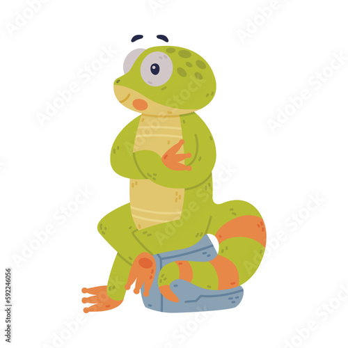 Fototapeta premium Funny Green Gecko Character with Bulging Eyes Sitting on Stone Vector Illustration
