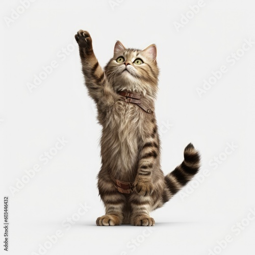 © visoot, Obraz premium Funny hair cat are standing and raising hand,AI generated.