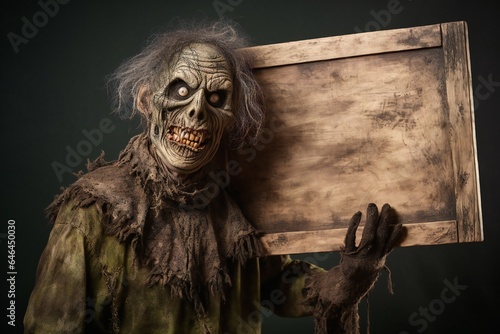 Fototapeta premium Funny Halloween zombie holding empty Wooden Board Generative AI
