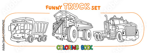 Fototapeta premium Funny heavy truck cars with eyes Coloring book set