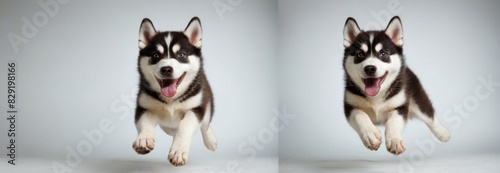 Obraz premium Funny husky or pet dog playing, jumping and looking happy during pretend play. Cute and happy crazy dog ​​head smiling