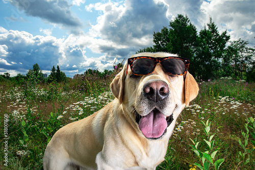 © Alexandr, Obraz premium Funny Labrador Retriever in sunglasses sitting on meadow