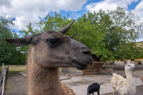 © Iva, Obraz premium Funny lama glama portrait, dark brown hairy animal, funny face expression, outdoors and daylight, sunny day and farm animal
