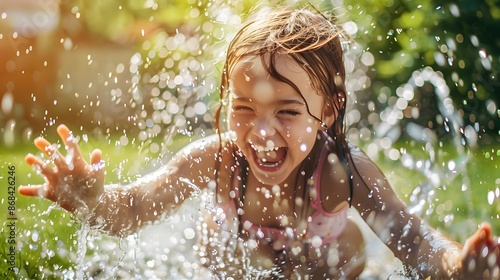© Farid, Obraz premium Funny laughing little girl running though garden sprinkler playing with water splashes in the backyard on a sunny hot summer vacation day.