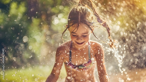 © Farid, Obraz premium Funny laughing little girl running though garden sprinkler playing with water splashes in the backyard on a sunny hot summer vacation day.