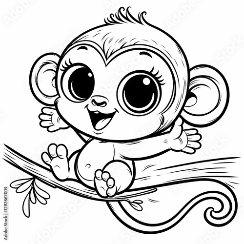 © Akram Mubarak , Fototapeta premium Funny line art sketch of a happy monkey swinging from a tree for coloring book