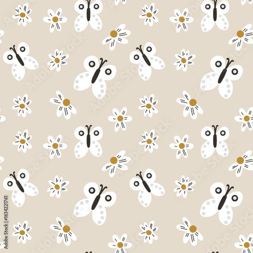 © Katsiaryna, Fototapeta premium Funny little bees in white with flowers on beige background. Ideal for nursery, packaging and nature-themed prints.