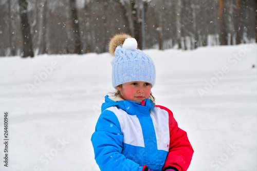 © Natasha , Obraz premium funny little girl playing with snow. child with snowball on a walk in the winter. Kids play outside. Winter fun concept.
