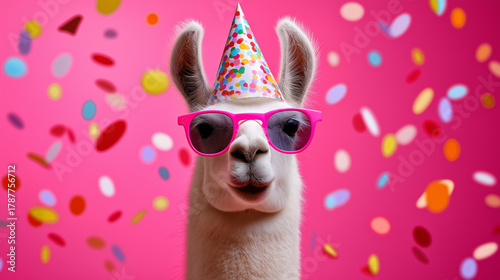 © Curioso.Photography, Fototapeta premium Funny llama wearing party hat and sunglasses with colorful confetti on pink background.