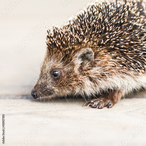 Obraz premium Funny Lovely Hedgehog Standing On Wooden Floor
