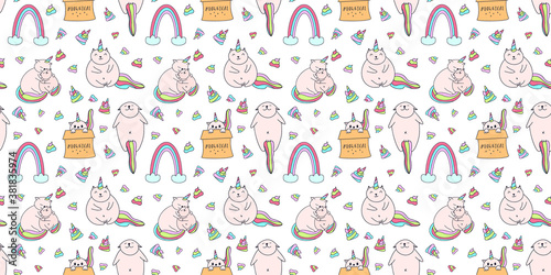 © Yana, Fototapeta premium Funny magical creature caticorn seamless pattern