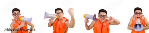 © Elnur, Naklejka premium Funny man wearing vest with loudspeaker