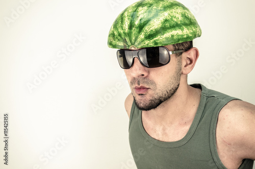 Fototapeta premium Funny man with a watermelon on his head. Hat covers the head