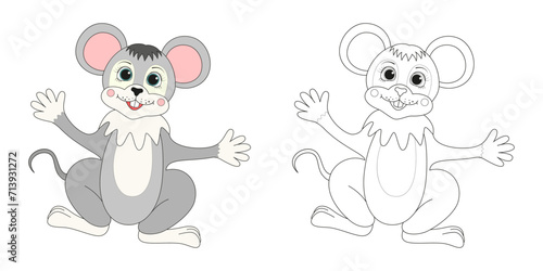 Fototapeta premium Funny mouse line and color illustration. Cartoon vector illustration for...