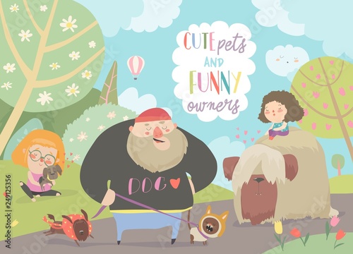 © Maria Starus, Naklejka premium Funny owners walking with their cute pets