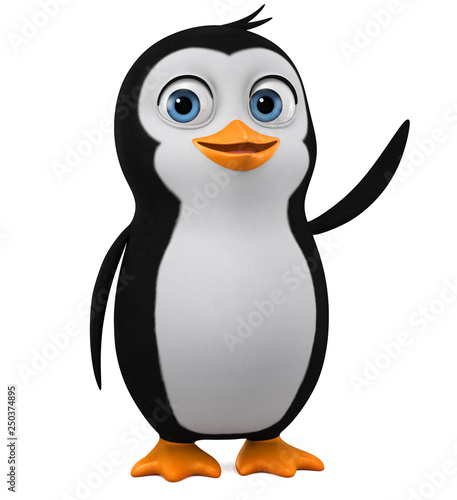© 3dddcharacter, Obraz premium Funny penguin points to an empty space. 3d render illustration.