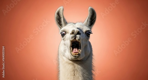 © Genta, Obraz premium Funny portrait of a surprised white llama with its mouth wide open against a coral background.