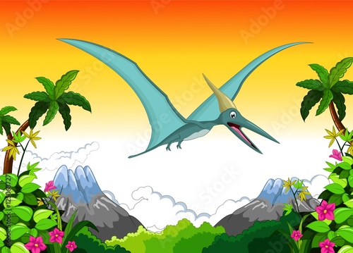 Naklejka premium funny pterodactyl cartoon in the jungle
