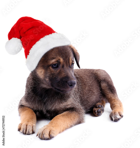 Obraz premium Funny puppy in Santa Claus hat isolated on white
