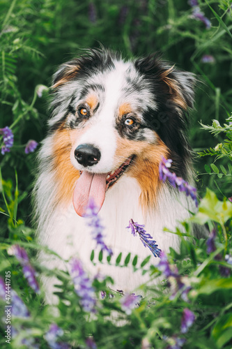 © Great Brut Here, Fototapeta premium Funny Red And White Australian Shepherd Dog Sitting In Green Grass With Purple Blooming Flowers. Aussie Is A Medium-sized Breed Of Dog That Was Developed On Ranches In The Western United States