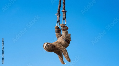 Fototapeta premium Funny sloth bungee jumping from a cable against a clear blue sky.