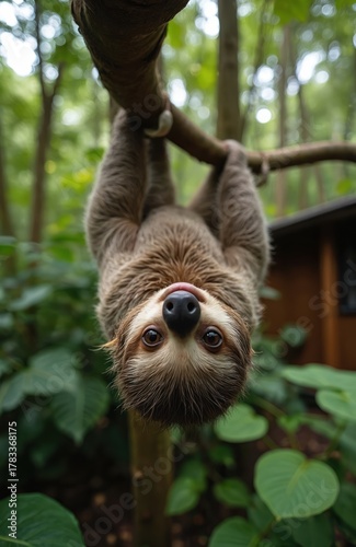 © Viktor, Obraz premium Funny sloth hangs upside down on tree branch looking at camera. Cute mammal shows tongue in rainforest. Wild animal hangs on wooden branch in wildlife sanctuary park.