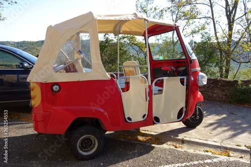 © Artem, Obraz premium Funny small retro bright red three-wheeled convertible motorcycle (microcar) parked at the sidewalk (Cordes-sur-Ciel, dept. Tarn, France. Oct. 2017)
