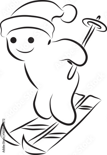 Fototapeta premium Funny smiling man in a hat skiing, hand drawn with a black brush with curved contours