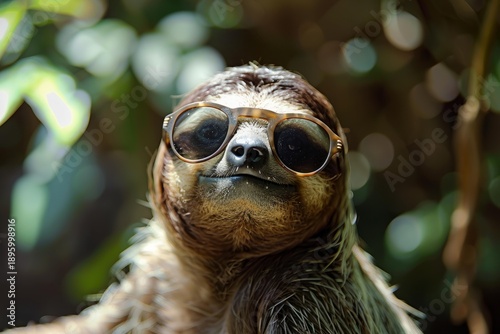 © nsit0108, Fototapeta premium Funny smiling sloth wearing sunglasses in the jungle, enjoying the sun
