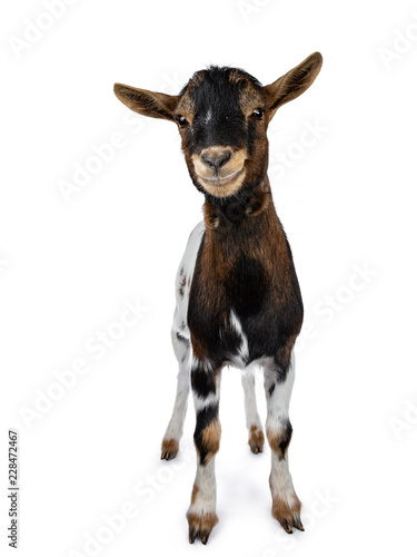 © Nynke, Fototapeta premium Funny smiling white, brown and black spotted pygmy goat standing front view looking curious to camera with tilted head, isolated on white background