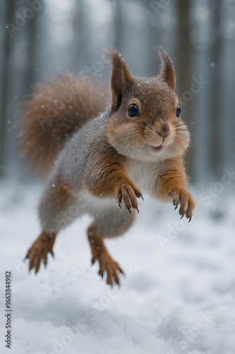 © alhaitham, Obraz premium Funny Squirrel Jumping Playfully Through Winter Snow