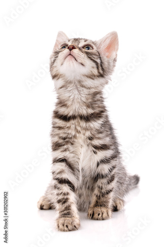 © serkucher, Fototapeta premium Funny striped kitten sitting and looking up. Isolated