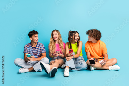 © deagreez, Obraz premium Funny teen friends hangout on a bright blue set chatting and smiling while phones glow with colorful screens in a sunny casual vibe