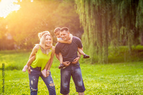 Fototapeta premium Funny time – Happy Parents playing with their children in the park.