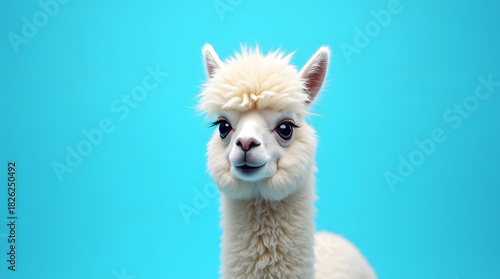 © Hanna Ohnivenko, Naklejka premium Funny white alpaca with a fluffy coat and endearing expression on a vibrant blue background, the alpaca's soft fur and gentle gaze standing out against the bright contrasting color, its large eyes