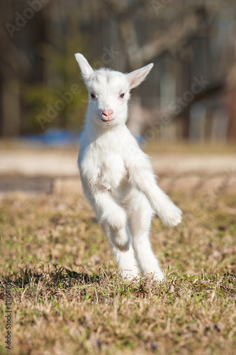 © Rita Kochmarjova, Obraz premium Funny white goatling playing outdoors